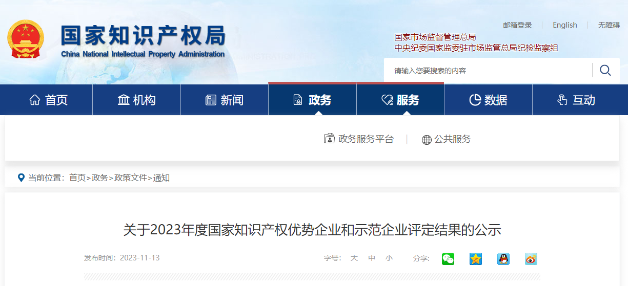 國知局:2023年度國家知識產(chǎn)權優(yōu)勢企業(yè)和示范企業(yè)評定結果公示